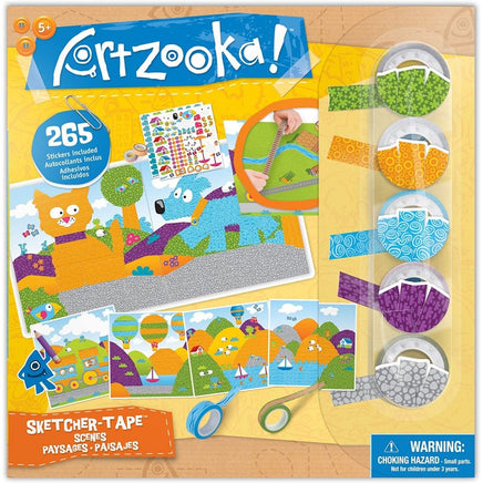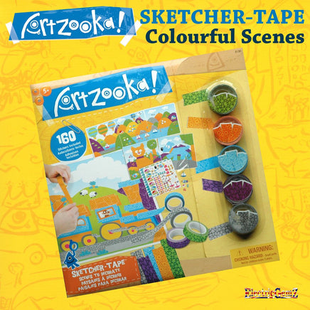 Suitable for, and specially designed to inspire ages 5+, Artzooka Sketcher-Tape - Scenes contains 6 big 28cm x 28cm printed card squares, which fit together in a variety of ways. Features include a train, a dog, a hot air balloon and lots of space for your own ideas. Also included are two big 28cm x 28cm sheets of 160 full-colour stickers - clouds, trees, birds, animals, all sorts of interesting things - plus 5 rolls of tape to roll out to create all kinds of interesting shapes - a brilliant idea!